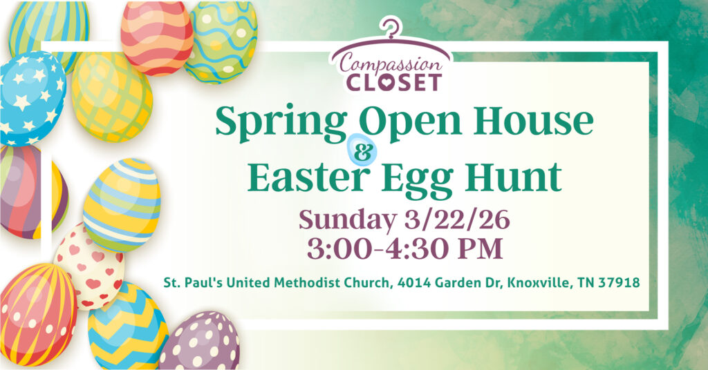 We will be doing an Easter Egg Hunt from 3:15–3:30 PM. Sign up at https://compassioncloset.com/springopenhouse